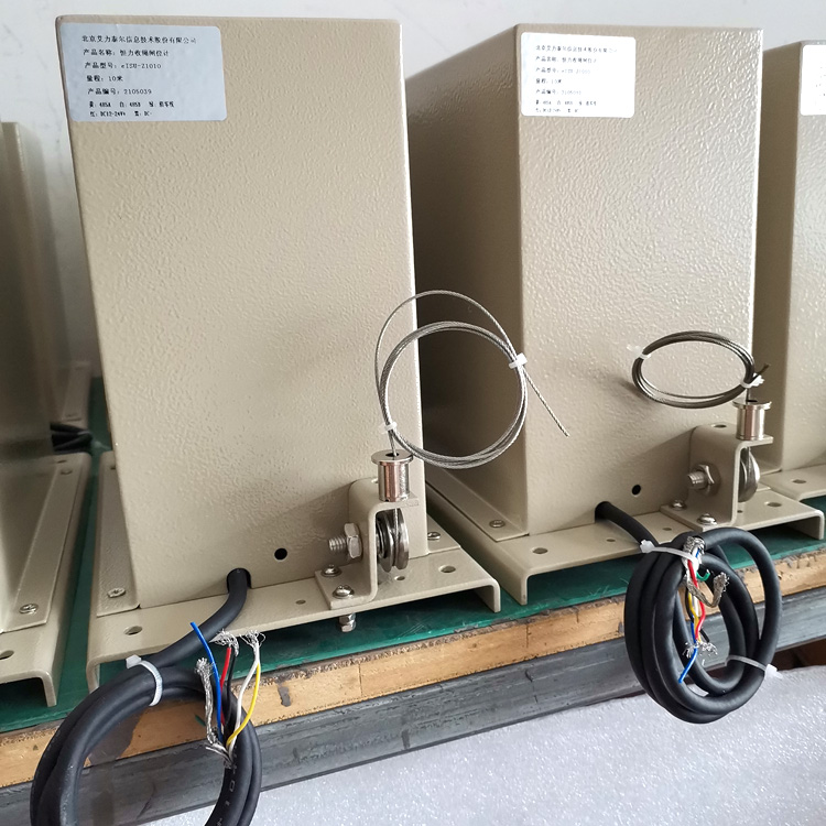 HZS型主令恒力收繩閘門開度傳感器,從內部拉出一根鋼絲繩與被測閘門直接聯結,閘門提升或下降時鋼絲繩帶動與編碼器同軸的測輪旋轉,使編碼器與被測閘門同步轉動,從而將被測閘門的啟降轉化為編碼器軸的旋轉,輸出相應的位置信息。同時帶動主令軸旋轉,控制閘門開啟、關閉的上、下限,從而達到了對被測閘門位移的實時測量同時控制閘門上、下限的目的。其內部的機械機構主要由恒力彈簧、彈簧輪、測輪、輪軸、齒輪箱、凸輪、限位開關等組成,下降過程由閘門拉動彈簧反繞,帶動機械機構轉動,上升則由反繞彈簧產生的力量帶動機械轉動、拉動鋼絲繩上升。該傳感器結構合理,安裝簡便、抗干擾能力強,分辨率高,量程大,壽命長,集檢測與A/D轉換為一體,有掉電后信號跟蹤記憶功能。它能夠長期用于被測件位移量的檢測,并能保證性能的穩定可靠。適合對各類閘門(平板門、弧形門、人字門、門機、橋機等)的起吊高度進行測量,控制。是江河湖泊、水庫、船閘、水電站、水文站、水廠及石油化工等行業理想測量與控制位移的傳感器。